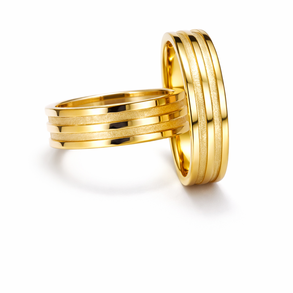 O par de alianças modelo anatômico com frisos combina elegância e conforto em um design sofisticado. O interior anatômico proporciona encaixe mais confortável no uso diário, enquanto os frisos com acabamento fosco adicionam um detalhe moderno e refinado ao visual.